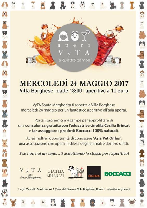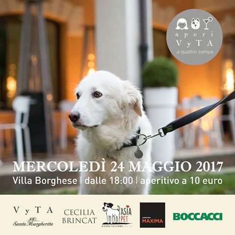 Roma, ottobre 2016. Per il ciclo AperiVyTA, mercoledì 24 maggio, VyTA Villa Borghese rilancia, dopo il successo dell’anno scorso, “AperiVyTA a 4 zampe”, l'happy hour all'aria aperta in compagnia degli amici pelosi, con i drink e il buffet d’eccezione VyTA Santa Margherita e tante attività e degustazioni biologiche dedicate a Fido.