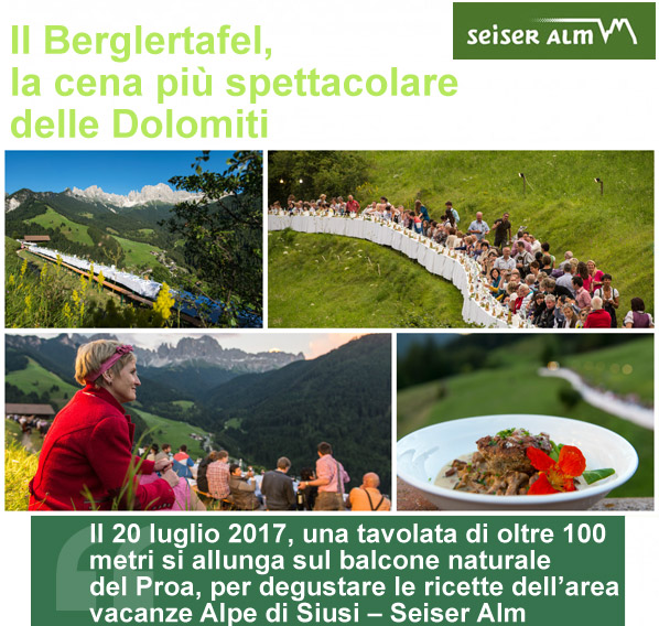 A caccia di cene originali? Tra le Dolomiti (Patrimonio Mondiale UNESCO) ce n’è una che le batte tutte, non solo per originalità, ma anche per lo spettacolo naturale unico che offre ai suoi commensali. È la tradizione del Berglertafel, la Cena del Montanaro di Tires al Catinaccio, nell’area vacanze Alpe di Siusi – Seiser Alm, che quest’anno viene apparecchiata il 20 luglio 2017, rispettando l’usanza del terzo giovedì del mese. Una lunga tavolata imbandita di ricette tipiche di Tires permette ai 170 invitati di degustare le prelibatezze locali al cospetto del tramonto sulle vette dolomitiche. La tavola, di oltre cento metri di lunghezza, è allestita in una posizione speciale: sul belvedere naturale del Proa, un alpeggio che si affaccia sul Catinaccio e consente di ammirare i colori dell’enrosadira da un punto di vista esclusivo. Il menu di 5 portate è squisito, i calici si innalzano al cielo d’estate sullo sfondo di un paesaggio senza tempo e l’atmosfera conviviale è di quelle indimenticabili.