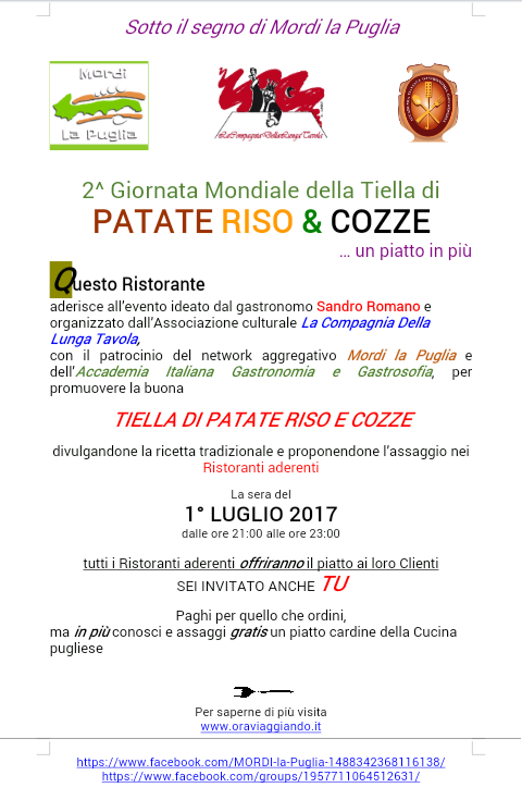“Sotto il segno di Mordi la Puglia” la sera del 1° luglio p.v., in numerosi ristoranti in Italia e all'estero – il cui elenco completo sarà a disposizione sul portale di Oraviaggiando (www.oraviaggiando.it) e su LSD Magazine (www.lsdmagazine.com), nonchè su altre testate giornalistiche e sui canali social di “Mordi la Puglia” – torna, dopo l’edizione del 2013, per divulgare la cultura gastronomica di tradizione pugliese, la Giornata Mondiale dedicata a un piatto bandiera della Puglia: la Tiella di patate riso e cozze.