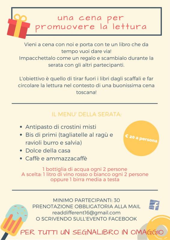 L'obiettivo è quello di tirar fuori i libri dagli scaffali e far circolare la lettura nel contesto di una buonissima cena toscana.