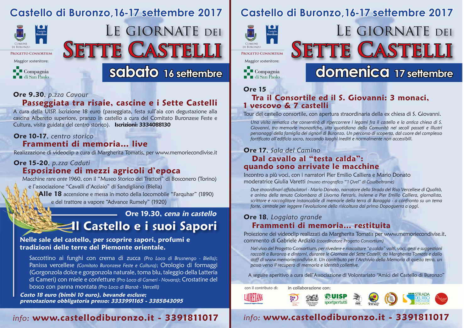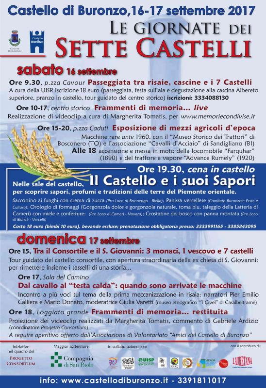 Sabato 16 e domenica 17 settembre 2017: a Buronzo prendono il via le Giornate dei Sette Castelli, nell’ambito del Progetto Consortium, attuato dal Comune di Buronzo grazie all’importante contributo della Fondazione Compagnia di San Paolo di Torino, maggior sostenitore.