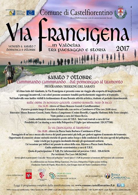 La Proloco sarà inoltre presente sabato 7 ottobre per una suggestiva passeggiata al tramonto, alla scoperta degli scorci panoramici più belli del tracciato della Via che attraversa le campagne tra Castelnuovo d'Elsa e Coiano. I partecipanti saranno accompagnati da guide ambientali escursionistiche professionali e resi partecipi della vita dei pellegrini del tempo che fu, con notizie di storia e cultura sui luoghi attraversati e i personaggi che vi si sono messi in cammino.