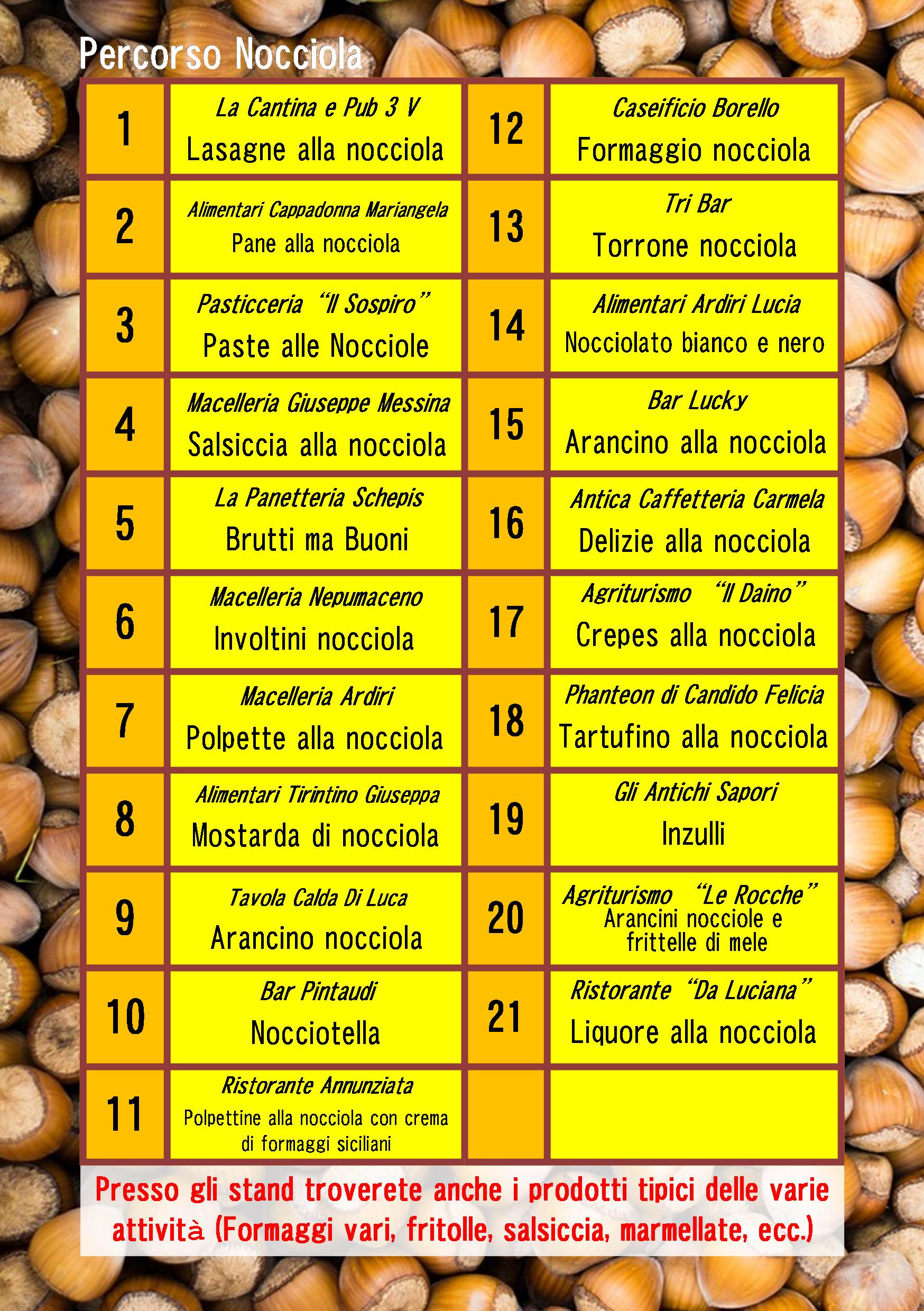 20 Postazioni gastronomiche con prodotti a base di nocciola, salumi, formaggi stagionati e freschi, vini, frittole, salsiccia, dolci, gelati, granite e tanto altro.