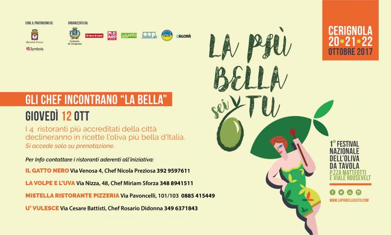 In attesa del 1° Festival Nazionale dell’Oliva da tavola che si terrà dal 20 al 22 ottobre - promosso dal Comune di Cerignola e realizzato in collaborazione con l’associazione Di terra di mare, Red Hot - impresa creativa, Adventa, ItaliaLab, Cerignola Produce - agenzia comunale per lo Sviluppo del Territorio e L’Agorà – gli chef de Il gatto nero, La volpe e l’uva, Mistella e U' Vulesce, declineranno in ricetta l’oliva più Bella d’Italia. Ogni ristorante proporrà un menù in cui l’oliva Bella di Cerignola sarà l’ingrediente principale.