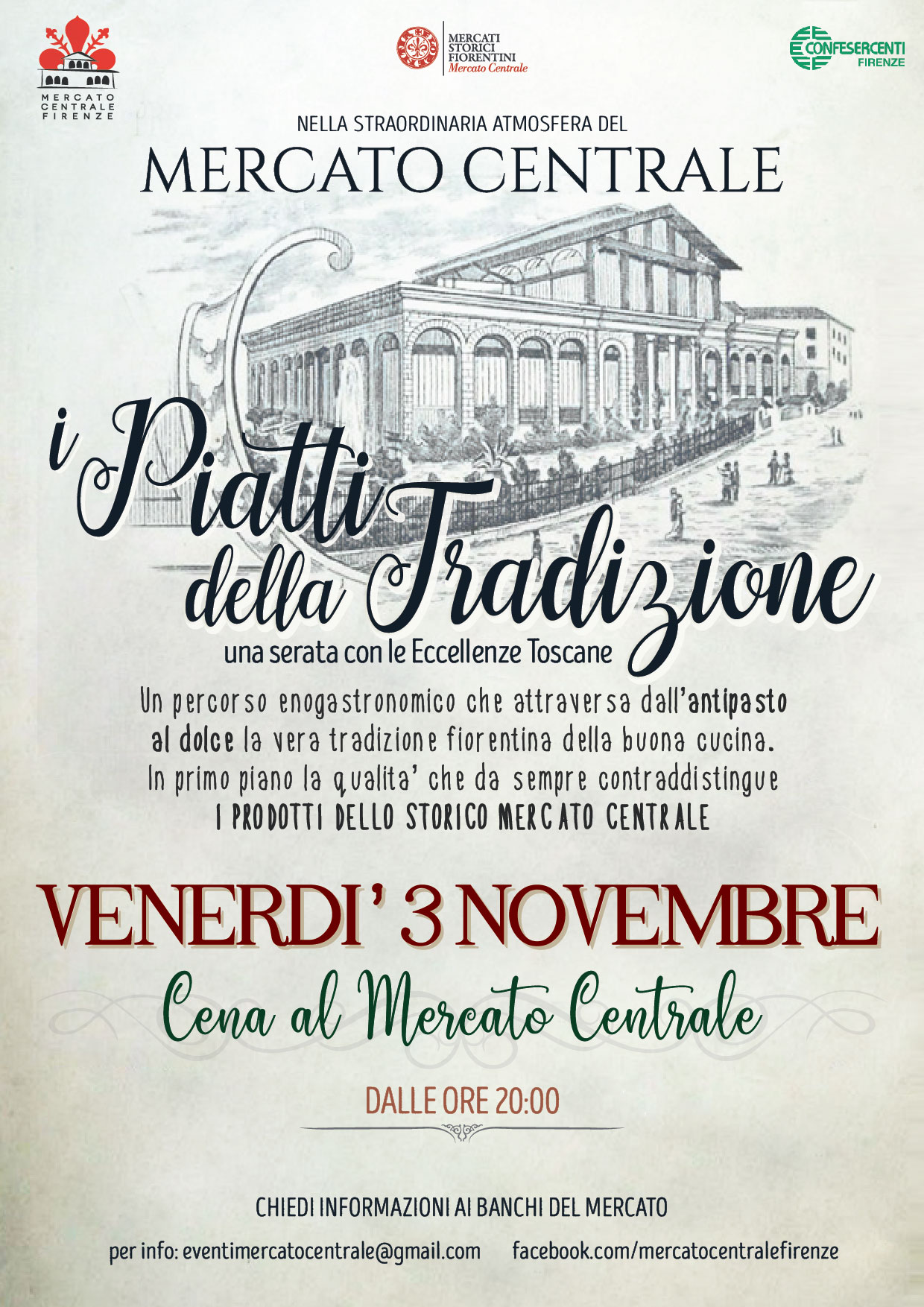 Nella meravigliosa cornice dello Storico Mercato Centrale aperto in esclusiva per una cena all'insegna dei piatti tradizionali Fiorentini.