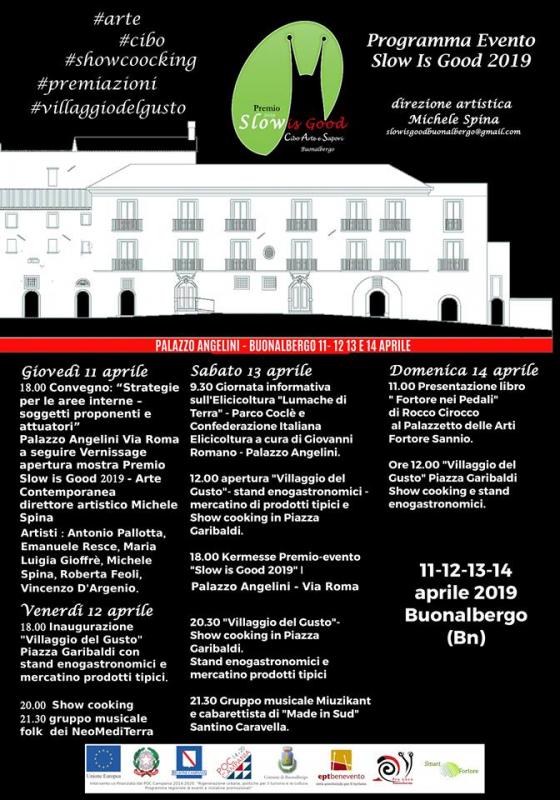 Nel settecentesco Palazzo Angelini sarà allestita la collettiva “Premio Slow is Good 2019 - Arte Contemporanea ”; esporranno sei giovani artisti di rilevanza nazionale: Antonio Pallotta, Emanuele Resce, Maria Luigia Gioffré, Vincenzo D’Argenio, Roberta Feoli e Michele Spina. In occasione del finissage, fissato per il giorno 3 maggio, verrà premiato l’artista che durante la permanenza della mostra presso Palazzo Angelini avrà ricevuto più voti dai visitatori.