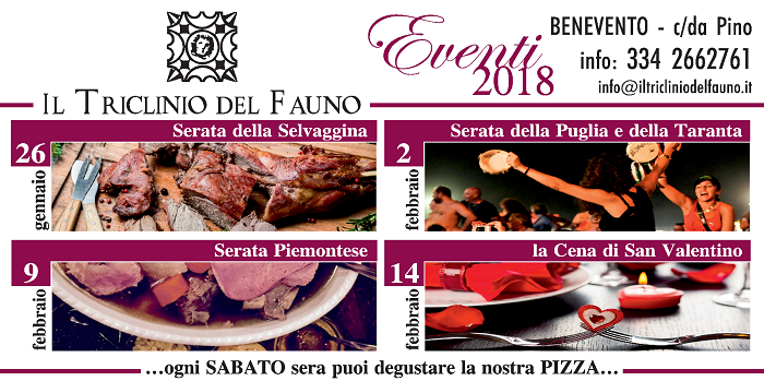 Il Triclinio del Fauno vi aspetta per diverse serate a tema dedicate alla scoperta di piatti e prodotti tipici della nostra Italia, che parlano dell'esperienza del nostro chef e raccontano chi siamo.I menu sono tutti comprensivi di bevande e dessert e tutti composti da 3 portate tra cui antipasto, primo piatto e secondo piatto. Inoltre, per la serata di San Valentino esiste la possibilità di pernottare in una delle 3 camere disponibili, uniche nel loro stile, spaziose e confortevoli.