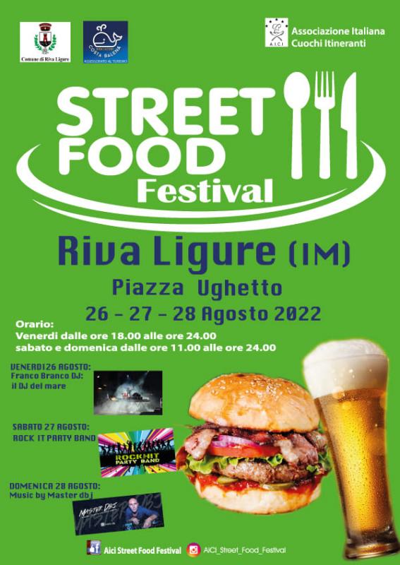 a Riva Ligure (IM) dal 26 al 28 Agosto 2022 L'Associazione Italiana Cuochi Itineranti porta lo Street Food Festival in piazza Ughetto dove si potranno gustare ed assaporare le proposte di operatori selezionati e rappresentanti la qualità del territorio locale e delle diverse regioni italiane come la grigliata di carne, gli arrosticini, la focaccia al formaggio.