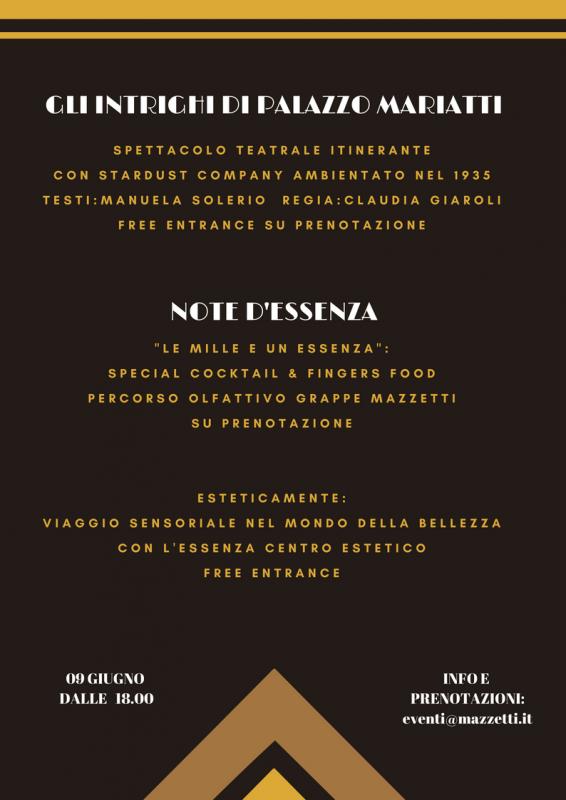 La rappresentazione è il frutto della fantasia dell’autrice casalese Manuela Solerio, per la regia di Claudia Giaroli, e porta il titolo di “Gli intrighi di Palazzo Mariatti”. La Stardust Company intende con tale opera parlare di bellezza come potere: se usata in modo malaccorto, tale virtù può anche diventare un’arma a doppio taglio. Il pubblico verrà trasportato nel 1936, per rivivere con la scrittrice giallista Mafalda Mariatti, un mistero occorso nella sua casa l’anno precedente. Da quei fatti Mafalda ha tratto un romanzo mostrando gli eventi così come si sono svolti secondo la sua visione. Ecco il dipanarsi di una vicenda intricata ed appassionante che vede coinvolte quattro figure di donne, totalmente diverse tra loro, sullo sfondo storico e sociale dell’Italia degli Anni Trenta. Lo spettacolo è in itinere, il pubblico segue i personaggi per diverse tappe attraverso l’azienda, per concludersi con l’epilogo nella cantina sotterranea e il successivo percorso sensoriale di bellezza a cura di L’Essenza Centro Estetico di Casale Monferrato.