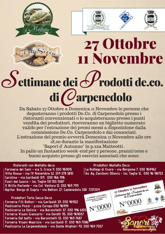 Nelle settimane che vanno da Sabato 27 Ottobre a Domenica 11 Novembre, tutte le persone che degusteranno il Malfatto De.Co. di Carpenedolo o la Torta Secca De.co. presso i ristoranti convenzionati o lo acquisteranno presso i punti vendita dei produttori, riceveranno un biglietto numerato valido per l'estrazione dei premi messi a disposizione dalla commissione De.Co. Carpenedolo e dai consociati.
