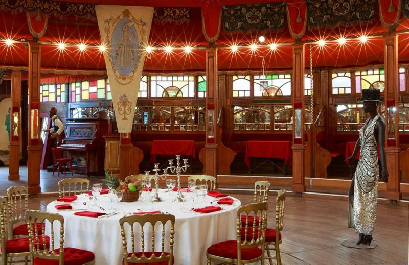 Una tenda con legni, specchi e vetri antichi, stile anni Trenta, con 170 posti a sedere per una cena elegante e raffinata con i migliori prodotti dell'enogastronomia di Langhe e Piemonte.