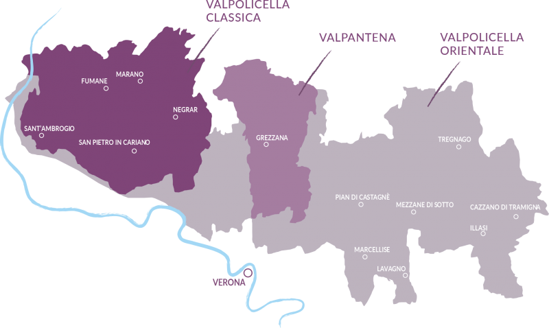 Valpolicella classico: l'uso della specificazione "classico" ai vini prodotti nella zona originaria più antica e comprende i 5 comuni di Sant'Ambrogio di Valpolicella, Fumane, San Pietro in Cariano, Marano e Negrar.