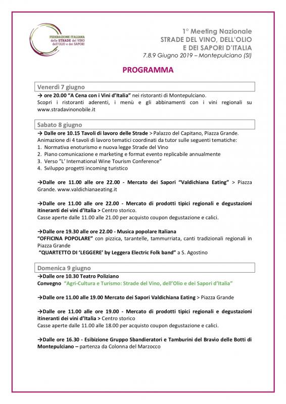 Fiore all’occhiello di questo 1° meeting il convegno “Agri-Cultura e Turismo: Strade del Vino, dell’Olio e dei Sapori d’Italia” in programma domenica 9 giugno alle 10:30 presso il Teatro Poliziano, alla presenza di Luciano Nieto, Capo segreteria Tecnica Ministero delle politiche agricole alimentari, forestali e del turismo, di Maria Elena Rossi Direttore Marketing e Promozione ENIT Italia e altri autorevoli relatori. Il Convegno è patrocinato dal MIPAAFT.