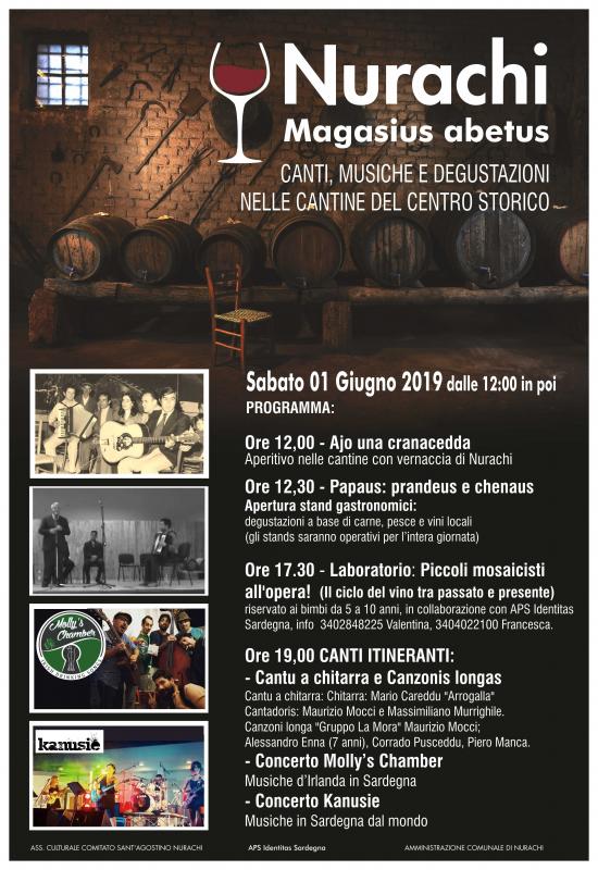 Tra un bicchiere e l'altro sarà possbile ascoltare i canti tradizionali a chitarra e a canzoni longa che si alterneranno nelle varie cantine. Il gruppo "La Mora" composto da Maurizio Mocci, Alessandro Enna (cantadori prodigio di soli 7 anni) Corrado Pusceddu e Piero Manca, ci allieterà con i canti a Canzoni Longa. Per i Canti a Chitarra si alterneranno Maurizio Mocci di Riola e Massimiliano Murrighile di Olbia Accompagnati dalla prestigiosa chitarra di Mario Careddu "Arrogalla" di Cabras.