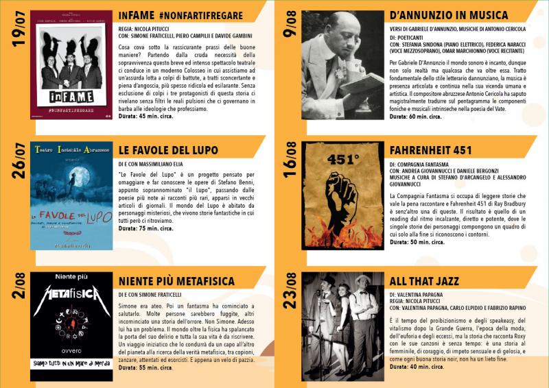 Per la rassegna sono stati selezionati 6 spettacoli rigorosamente a chilometro zero che si contraddistinguono per l’elevato livello professionale, l’adeguata leggerezza e la ragionevole durata, digeribile in un simile contesto. Si parte, il 19 luglio, con la nuovissima produzione Cronosfera intitolata “inFAME #nonfartifregare” per la regia di Nicola Pitucci, in scena Simone Fraticelli, Piero Campilii e Davide Gambini ci faranno scoprire cosa cova sotto la rassicurante prassi delle buone maniere: una lotta a colpi di battute, a tratti sconcertante e piena d’angoscia, più spesso ridicola ed esilarante. Il 26 lugliosarà la volta di Massimiliano Elia con “Le favole del lupo”, un progetto pensato per omaggiare e far conoscere le opere di Stefano Benni, soprannominato “il Lupo”. Simone Fraticelli accoglierà il pubblico il 2 agostocon una coinvolgente avventura intitolata “Niente più metafisica”, un viaggio iniziatico che lo condurrà da un capo all’altro del pianeta tra copioni, zanzare, attentati ed esorcisti. Il 9 agosto una serata dedicata al vate: “D’Annunzio in musica”, i versi del poeta pescarese e le musiche originali di Antonio Cericola faranno da sfondo a uno spettacolo firmato dai Poeticanti, nel quale la voce di Omar Marchionno sarà accompagnata dal pianoforte elettrico di Stefania Sindona e dal canto del mezzosoprano Federica Naracci. La Compagnia Fantasma, il 16 agosto, farà riscoprire Fahrenheit 451 di Ray Bradbury, grazie alle voci di Andrea Giovannucci e Daniele Bergonzi, musiche di Stefano D’Arcangelo e Alessandro Giovannucci: un reading incalzante, diretto e potente in cui le storie dei personaggi compongono un quadro del quale solo alla fine si riconoscono i contorni. Una conclusione all’insegna della musica e dei Ruggenti Anni Venti, il 23 agosto, con lo spettacolo noir “All that Jazz” di e con Valentina Papagna, l’attrice pescarese sarà affiancata da Carlo Elpidio e Fabrizio Rapino, con i quali ripercorrerà il periodo del proibizionismo e degli speakeasy, raccontato attraverso le canzoni senza tempo della giovane Roxy.