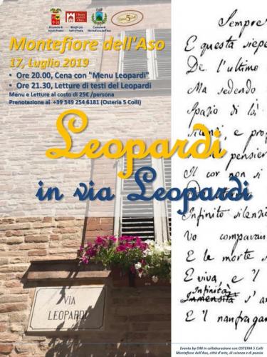 Il 17 luglio dalle ore 20.00, via Leopardi di Montefiore, una naturale piazzetta nel cuore del castello di Montefiore, profuma delle pietanze care al Leopardi, per poi alle 21.30 risuonare delle sue poesie attraverso le voci degli abitanti di Montefiore, umili lettori di immemorabili opere poetiche.