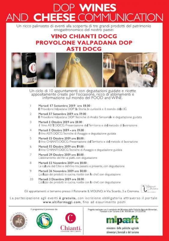 A partire dal prossimo 17 Settembre, a Cremona, ASTI DOCG, PROVOLONE VALPADANA DOP E CHIANTI DOCG saranno i protagonisti di un programma di valorizzazione destinato al grande pubblico: 10 appuntamenti che alterneranno degustazioni guidate, show cooking, tecniche di assaggio e formazione sul mondo delle Indicazioni Geografiche del FOOD and WINE.