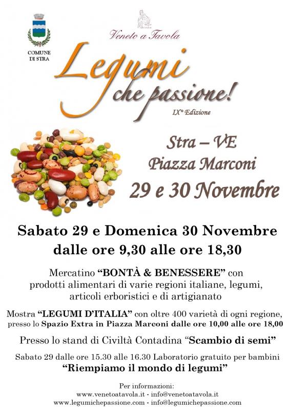 La manifestazione LEGUMI CHE PASSIONE, giunta alla IX edizione, si terrà a Stra, nella Riviera del Brenta, in Piazza Marconi, sabato 29 e domenica 30 novembre. Promossa dal Comune di Stra e organizzata da Veneto a Tavola, in collaborazione con alcune associazioni.