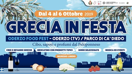 Da Venerdì 4 a Domenica 6 Ottobre presso il Parco di Ca' Diedo all'interno della rassegna Oderzo Food Fest 2019 va in scena l'8° edizione del format enogastronomico "Grecia in Festa" dedicato al Gusto e al Divertimento dal Peloponneso.