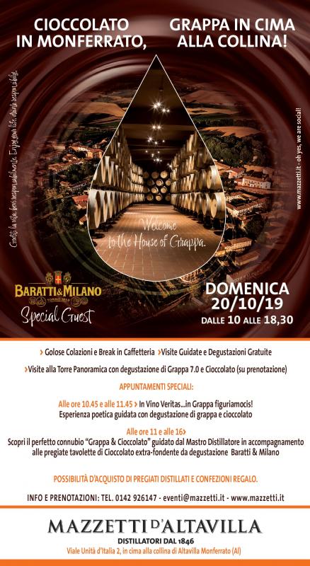 Grappa e cioccolato rappresenta uno dei connubi più graditi dagli estimatori dei distillati. E domenica 20 ottobre ci saranno tante occasioni per scoprire le sfaccettature di questo incontro sensoriale e di numerose altre curiosità legate ai distillati e al territorio piemontese grazie agli eventi che Mazzetti d’Altavilla – Distillatori dal 1846 propone presso la storica sede in cima alla collina di Altavilla Monferrato. Gli appuntamenti sono programmati in occasione di “Cioccolato nel Monferrato”, manifestazione che si svolgerà nel centro del borgo altavillese portando esposizioni e iniziative dedicate in particolare al re delle golosità.