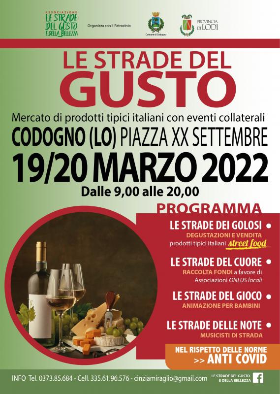 Tappa della manifestazione “LE STRADE DEL GUSTO”, organizzato dall’Associazione Le strade del gusto e della bellezza di Crema, nella centralissima Piazza XX Settembre di Codogno (LO) il 19/20 MARZO, il salotto bello del paese, dove i bar affollati ogni giorno dimostrano il carattere della comunità codognese socievole e amante del buon vivere…