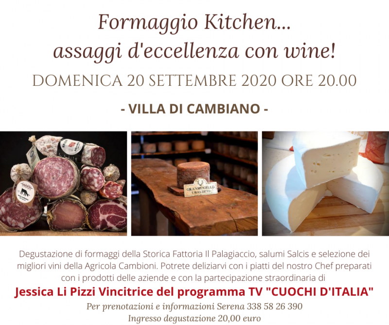 Domenica 20 settembre, dalle 20:00, presso la bellissima Villa di Cambiano a Castelfiorentino potete degustare i formaggi della Storica Fattoria Il Palagiaccio, i salumi Salcis e una selezione dei migliori vini della Agricola Cambioni.