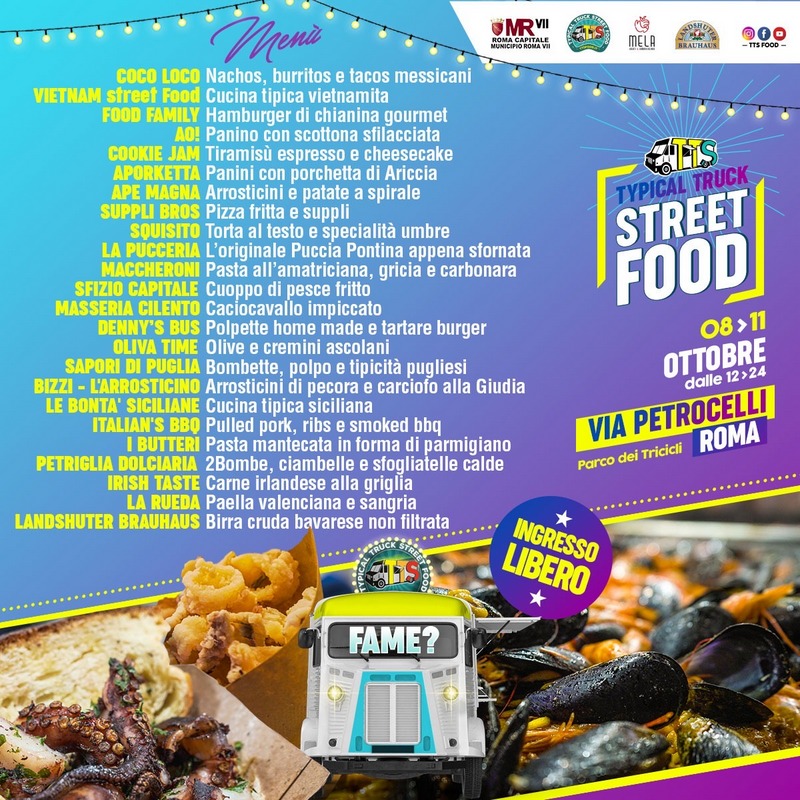 L'evento itinerante più divertente e gustoso dell'anno porterà, a due passi dalla Romanina, tra Tor Vergata e l'Anagnina, il meglio del mondo Street Food. 24 postazioni cucina per un'incredibile festa del cibo da strada. Un appuntamento incredibile nel cuore di Roma. Cibo eintrattenimento musicale per una quattro giorni da non perdere. Rispettando tutte le norme anti Covid-19, sarà l'occasione per poter assaporare vere e proprie specialità gastronomiche preparate in modalità espressa da una brigata di Street Chef accuratamente selezionati dal Team TTS. Si potrà scegliere il piatto preferito, ordinandolo presso i caratteristici truck, le colorate ape-car e gli stand cucina, mangiarlo insieme ad amici e parenti con l'inconfondibile stile Street Food by TTS. Ghiottonerie appetitose sotto il cielo di Roma e Via Petrocelli che si trasformerà nel più grande ristorante all'aperto sotto le stelle di Roma dove poter mangiare sia a pranzo che a cena fino alle ore 24 con accompagnamento musicale, dj-set e tanti giochi di luce e gli artisti di strada della compagnia del CIRCUS VILLAGE. Affascinanti performance vi stupiranno con esibizioni, fire show, giochi e tante sane risate.