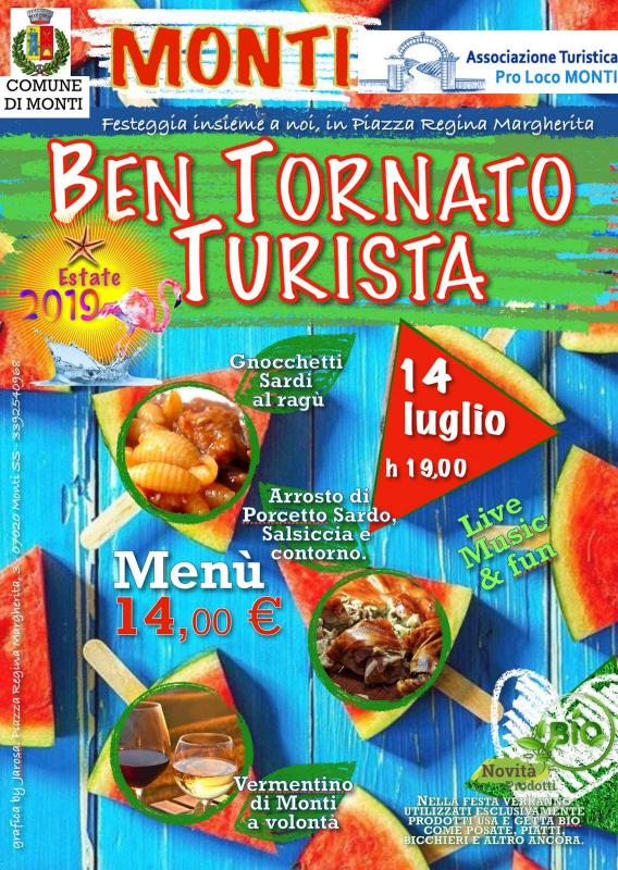Dopo aver chiuso la scorsa stagione estiva con il 'Saluto al turista' si aprono i festeggiamenti dell'estate montina 2019 con l'evento "Ben Tornato Turista", la manifestazione enogastronomica promossa dal Comune e dalla Pro loco di Monti, che Domenica 14 Luglio 2019, dalle 19.00 in Piazza Regina Margherita proporrà a tutti i partecipanti un menù accattivante a base di prodotti sardi: gnocchetti al ragù, porcetto arrosto, salsiccia, contorno e Vermentino di Monti a volontà.