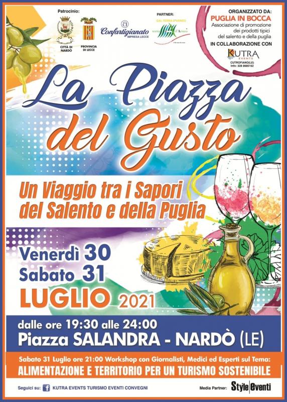 In Piazza Salandra a Nardò in provincia di Lecce si svolge nei giorni Venerdì 30 e Sabato 31 Luglio 2021, dalle ore 19.30 alle ore 24.00, la manifestazione "La Piazza del Gusto".