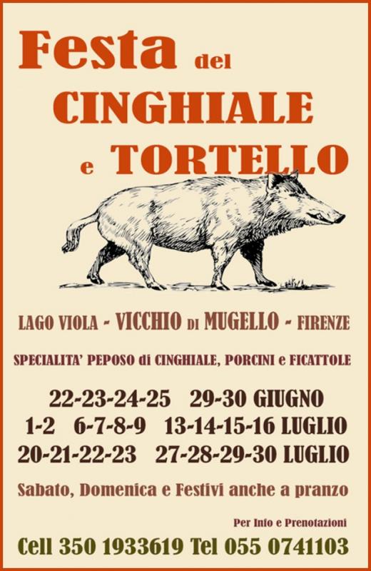 Torna la Festa del Cinghiale e del Tortello a Vicchio, racchiude due tipicità del Mugello, il cinghiale e il tortello appunto, specialità che potrete gustare sul Lago Viola, situato in Località Boccagnello a Vicchio. Oltre ai Tortelli e ai tagliolini fatti in casa potrete gustare tutte le nostre specialità: antipasti, primi piatti di cinghiale, porcini ed annoveriamo tra i secondi: il peposo, le bistecche ed il carré, carne alla brace. Infine, i nostri dolci sono completamente di nostra produzione.