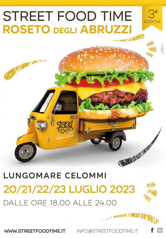 Il Tour di Street Food Time è felicissimo di tornare nella splendida ed elegante città di Roseto degli Abruzzi per regalare grande sapore e gioia condivisa con serate all'insegna del piacere culinario con la proposta di delizie provenienti da ogni regione d'Italia. Ottimo cibo accompagnato da una vasta selezione di birre rigorosamente artigianali. I fuochi si accenderanno alle ore 18.00 e resteranno accesi fino a tarda notte.