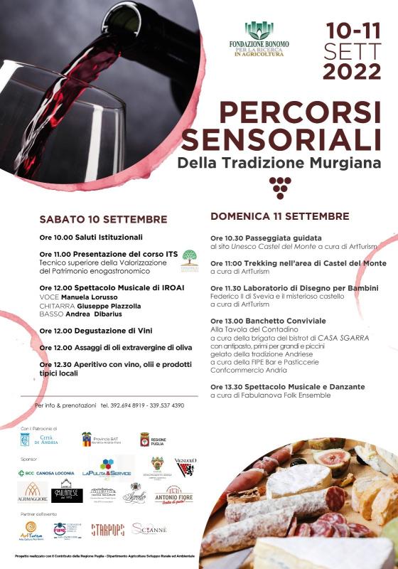 Sabato 10 e domenica 11 settembre c.a., presso la sede della Fondazione Bonomo per la ricerca in agricoltura, sita ad Andria in zona Castel del Monte, C.da Castel del Monte cs, si terrà l'evento "PERCORSI SENSORIALI DELLA TRADIZIONE MURGIANA".