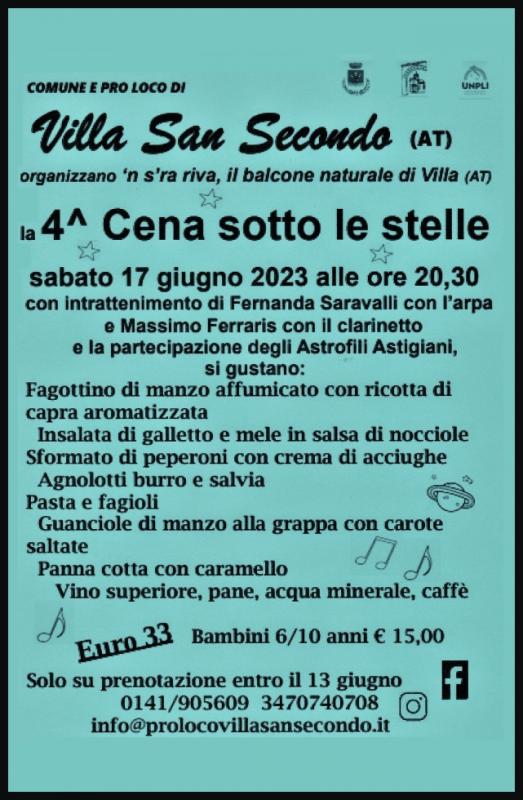 Il Comune e la Pro Loco di Villa San Secondo (AT) organizzano 'n s'ra riva, il balcone naturale di Villa (AT) la 4a Cena sotto le Stelle Sabato 17 Giugno 2023 alle ore 20.30 con intrattenimento di Fernanda Saravalli con l'arpa e Massimo Ferraris con il clarinetto e la partecipazione degli Astrofill Astigiani.