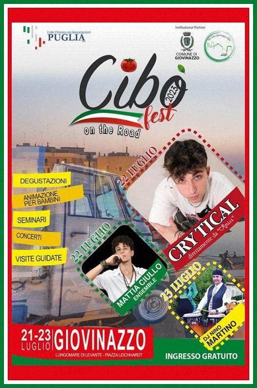 Presso il Lungomare di Levante a Giovinazzo in provincia di Bari si svolge nei giorni dal 21 al 23 Luglio 2023 la 2a Edizione di CibòFest on the Road.