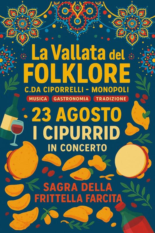 L’associazione “ Amici di Ciporrelli” organizza a Monopoli in contrada Ciporrelli “la 16 edizione “ La Vallata del folklore” il 23 Agosto con una splendida “SAGRA DELLA FRITELLA FARCITA” ricca di specialità nostrane e degustazione tipiche ricercate dalle nostre nonne. Tutto accompagnato da buon vino e birra.