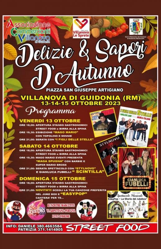 In Piazza San Giuseppe Artigiano a Villanova, frazione del Comune di Guidonia, in provincia di Roma si svolge nei giorni 13, 14, 15 Ottobre 2023 la manifestazione Delizie e Sapori d'Autunno.