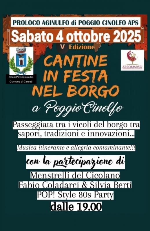 A Poggio Cinolfo, frazione del Comune di Carsoli in provincia di L'Aquila si svolge nella giornata di Sabato 04 Ottobre 2025, dalle ore 19.00, la nuova edizione di Cantine in Festa nel Borgo.