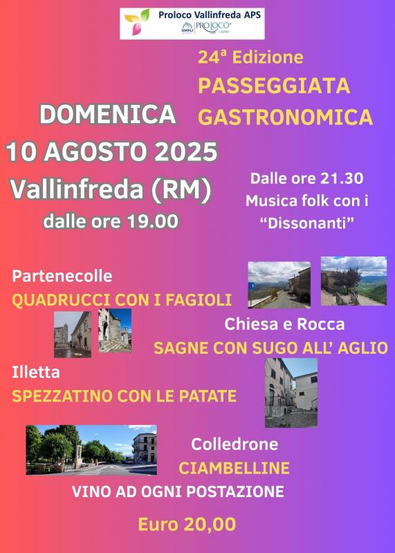 Ore 19.00 24^ edizione della Passeggiata Gastronomica per le Vie del paese e Piazza del Mercato.