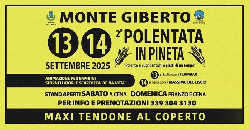 Un' appuntamento con i sapori della tradizione e i piatti di un tempo....protagonista sarà LA POLENTA quella di un tempo, sul caldaio in rame e girata a mano , intrattenimenti per tutti i gusti, animazione per bambini, stornelli con MARCO E Walter ,si balla con i FLAMBAR e il MASSIMO DEL LISCIO , il tutto nella splendida location della PINETA ...... MAXI TENDONE AL COPERTO !!