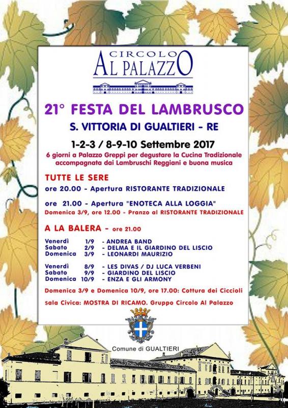 Le Notti del Lambrusco a S. Vittoria di Gualtieri (RE) si svolge nei giorni 29, 30, 31 agosto e 5, 6, 7settembre 2025.