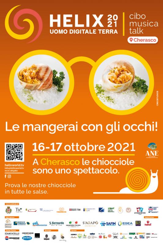 HELIX 2021 è organizzato dall'ANE - Associazione Nazionale Elicicoltori - e dall'Istituto Internazionale di Elicicoltura su impulso del suo vulcanico Presidente Simone Sampò. Si svolge a Cherasco (Cuneo) sabato 16 e domenica 17 ottobre presentando una serie di inediti e novità - tra cui la partecipazione dei Ministri dei paesi che hanno sposato il "Metodo Cherasco" - specchio del grande fermento che ruota intorno all'economia elicoidale, l'economia pulita ed etica che si genera dalla chiocciola e che, a spirale, raggiunge e coinvolge già oltre 13 settori produttivi (approfondimento scheda economia elicoidale).