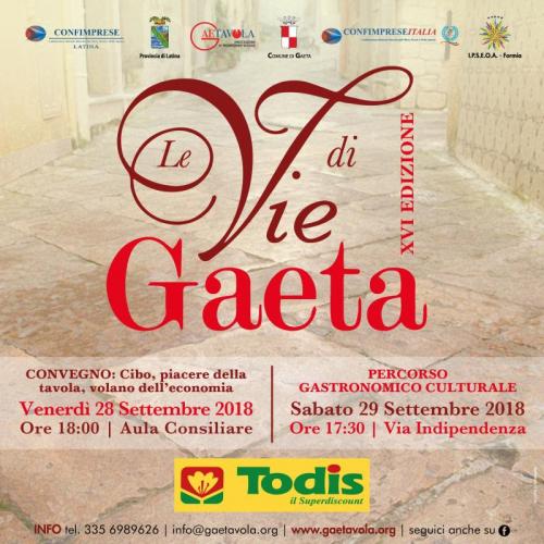 Il 28 ed il 29 settembre p.v. è in fase di programmazione la XVI edizione de “Le Vie di Gaeta” storica iniziativa nata con l’intento di rivalutare le tradizioni gastronomiche che sono parte integrante della cultura locale.