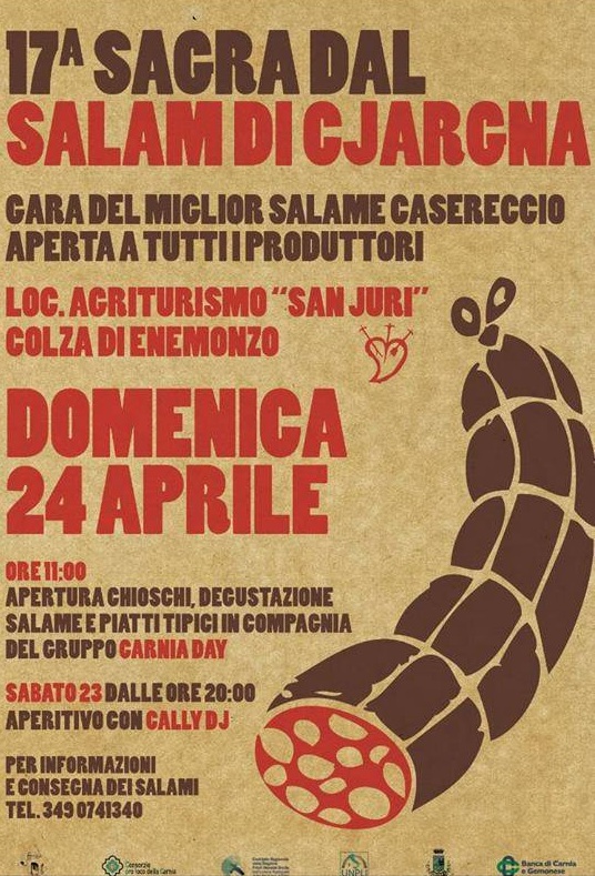 17° Sagra dal Salam di Cjargna (Sagra del Salame Carnico) a Enemonzo (UD) si svolge il 24 aprile 2016, preceduta il 23 da un'aperitivo con dj set.