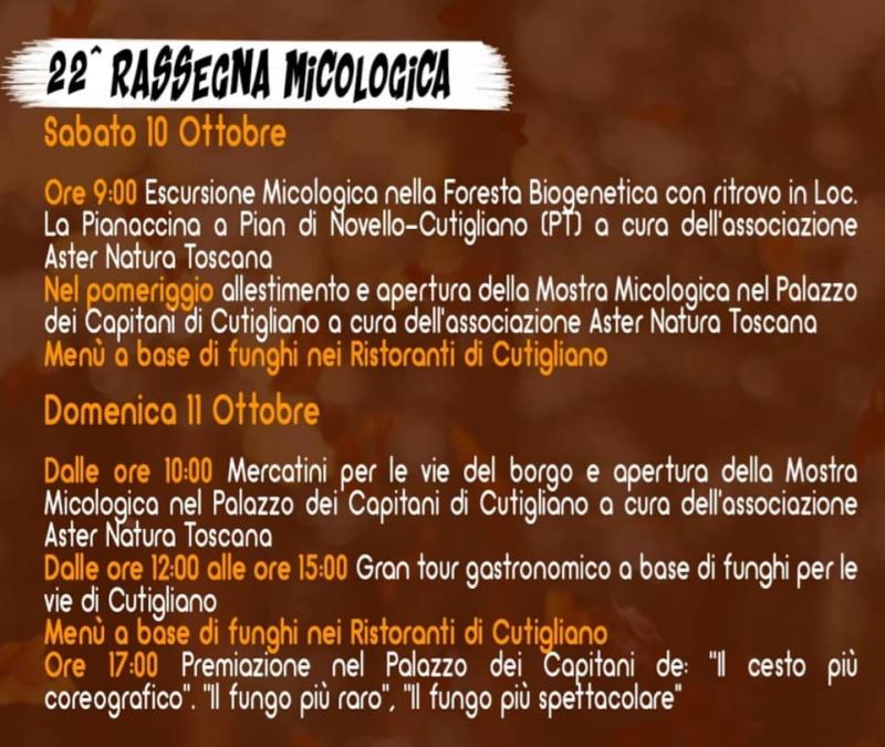 - Nel pomeriggio allestimento e apertura della Mostra Micologica nel Palazzo dei Capitani di Cutigliano a cura dell’associazione Aster Natura Toscana