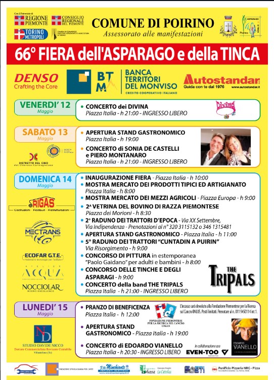 Dal 12 al 15 maggio 2023 si terrà la 66° edizione della Fiera dell’asparago e della tinca a Poirino.