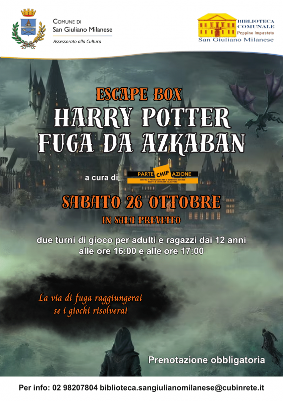 Immergiti nell'atmosfera magica del mondo di Harry Potter con l'evento "Fuga da Azkaban". Un'escape room coinvolgente, dedicata a ragazzi e adulti, dove potrai risolvere enigmi e trovare la via di fuga. L'ingresso è gratuito, ma è necessaria la prenotazione. Iscriviti subito, ci sono ancora posti disponibili!