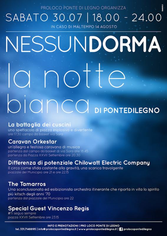 Sabato 30 luglio dalle 17.30 torna Nessun Dorma la Notte Bianca di Ponte di Legno. Le vie e le piazze del paese si animeranno con performance musicali, circo contemporaneo, una battaglia di cuscini e - in chiusura - con la coinvolgente comicità di Vincenzo Regis.