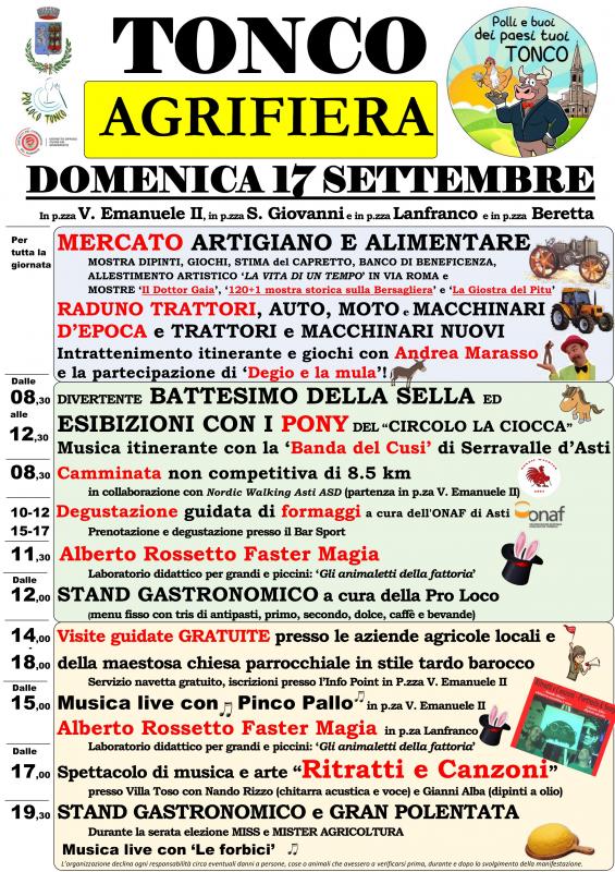 Nel pomeriggio, alle 14 inizieranno le visite guidate gratuite presso le aziende agricole locali, vere protagoniste della manifestazione. I visitatori potranno osservare da vicino le eccellenze e gli allevamenti tonchesi di galline e polli “a collo nudo”, le mucche e buoi di razza piemontese e gli splendidi cavalli del Circolo Ippico La Ciocca. Servizio navetta gratuito, iscrizioni presso l’Info Point in p.zza V. Emanuele II. Visite guidate anche alla maestosa chiesa parrocchiale in stile tardo barocco. L’intrattenimento musicale sarà garantito dal musicista Pinco Pallo, e da “Ritratti e Canzoni” , spettacolo di musica e arte nel parco di Villa Toso con Nando Rizzo (chitarra acustica e voce) e Gianni Alba (dipinti a olio). Saranno proposti nuovamente il laboratorio con i piccoli animali della fattoria e la degustazione guidata di formaggi.