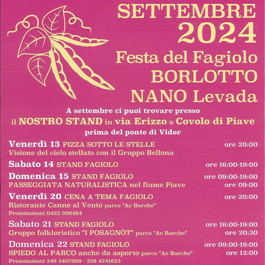 A Covolo di Piave, frazione del Comune di Pederobba, in provincia di Treviso si svolge nei giorni dal 14 al 22 Settembre 2024 la Festa del Fagiolo Borlotto Nano Levada.