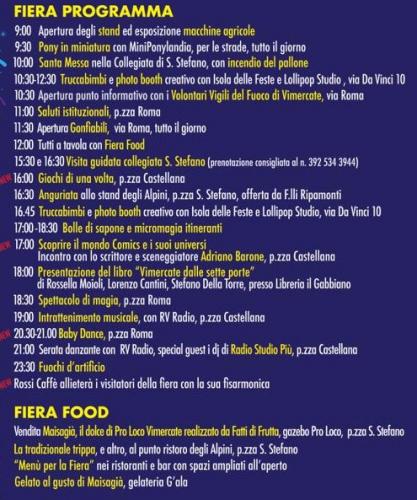 FIERA FOOD Vendita Maisagia, il dolce di Pro Leo Vimercate redimilo da Folti di Ritta, gazebo Pro Loco, p.zza 5. Stefano La tradizionale trippa, e altro, al punto ristoro degli Alpini, p.zza S. Stefano "Meni, per la Fiero" nei ristoranti e bar con spazi ampliali all'aperto Gelato ol gusto di Maisagia, gelateria G'ala
